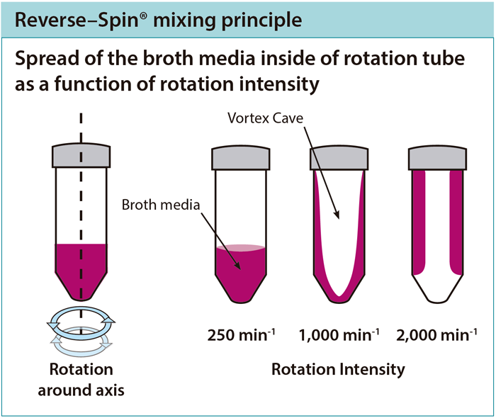 A tecnologia Reverse–Spin® da BIOSAN traz um princípio inovador para o cultivo microbiano em seus modelos de biorreatores (RTS-1, RTS-1C, e o RTS-8). O princípio de mistura Reverse-Spin® (RS) é um método de agitação acionado mecanicamente onde a suspensão de células é misturada pela rotação do tubo em torno do seu eixo com uma mudança de direção do movimento de rotação resultando em alta eficiência e oxigenação na mistura para células em crescimento (Figura 1). Em estudo onde se avaliou a cinética do crescimento celular usando tubos Falcon agitados pelo princípio Reverse-Spin®, as condições de crescimento para vários microrganismos como E.coli, B.subtilis, Thermophillus sp., microaerofílico L.acidophilus e levedura metilotrófica P.pastoris foram otimizados. Através do seu dispositivo é possível fazer o registro de biomassa que mede turbidez da amostra em tempo real. Possui um software intuitivo que torna possível definir parâmetros ideais de fermentação com intensidade de mistura e