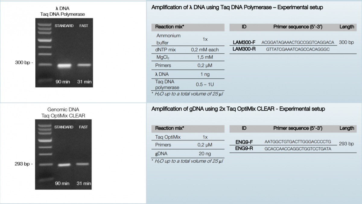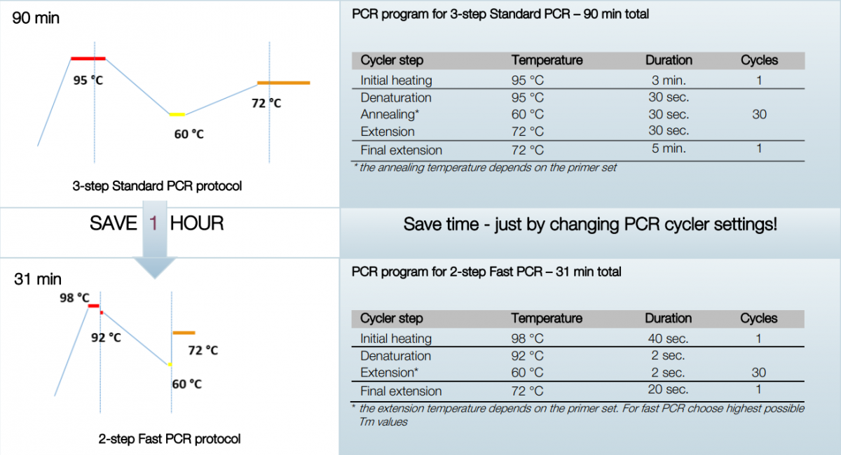 Dependendo do instrumento de PCR em tempo real aplicado e do alvo de DNA usado, com redução das etapas de desnaturação e extensão, os tempos totais de execução variam em aproximadamente 41 – 61 minutos o que representa redução significativa em comparação com o protocolo padrão com um tempo total de execução de aproximadamente 83 minutos.